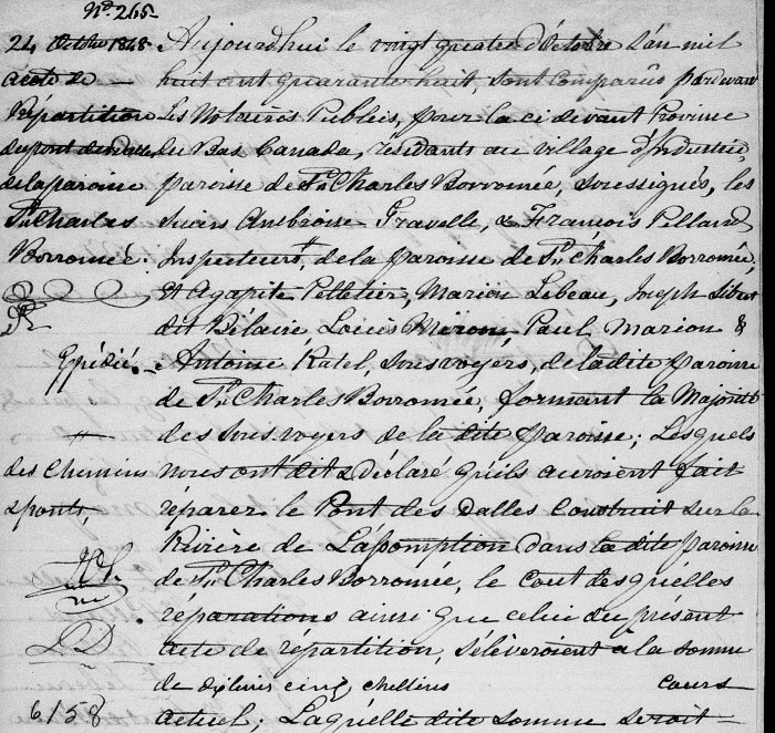 L’administation de l’entretien des chemins était toujours assumée par les habitants du village; le 5 mai 1843 Henry Hall et Severin Ferland ont été élus syndics. En 1848 les sieurs Ambroise Gravelle, François Pelland inspecteurs de la paroisse de St-Charles-Borromée et Agapite Pelletier, Marion Lebeau, Joseph Sibert dit Bélaire, Louis Miron, Paul Marion et Antoine Ratel, sous-voyers de la dite paroisse avaient fait réparer le pont des Dalles pour la somme de 10 livres 5 chelins, somme qui devait être répartie entre les propriétaires chargés de l’entretien de ce pont selon l’ordonnance qui répartissait aussi les coûts des écoles: Acte de répartition du pont des Dalles de la paroisse St-Charles Borromée.