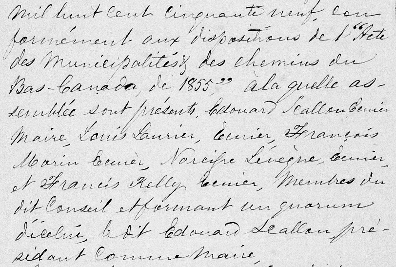 Le 2 mars 1864 à une assemblée spéciale du conseil tenue à l’hôtel de ville les premiers règlements municipaux ont été adoptés. Les membres présents et formant quorum étaient G. Baby pro-maire et les conseillers Ed. Scallon, Chs. H. Panneton, Elz. Cornellier, J. Rivet et Ed. Guilbault.