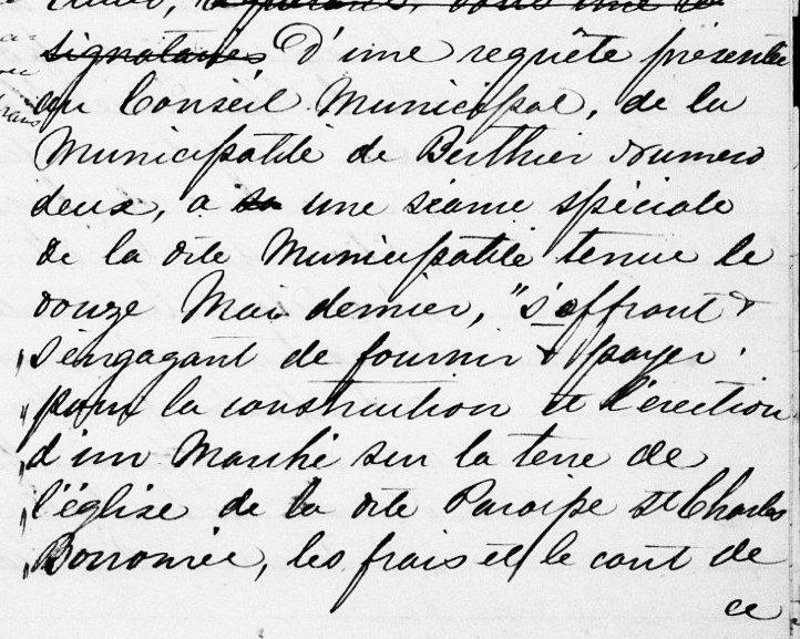 Que le dit conseil de la dite municipalité de Berthier N°2 à sa séance spéciale du 12 mai 1851 aurait ordonné l’adoption de la requête de Peter Charles Loedel Ecuyer et autres, demandant l’érection d’une Halle de Marché public sur la terre de l’église…