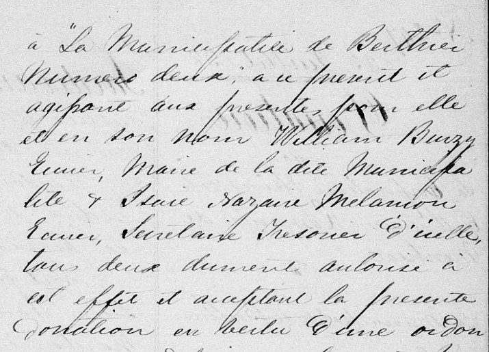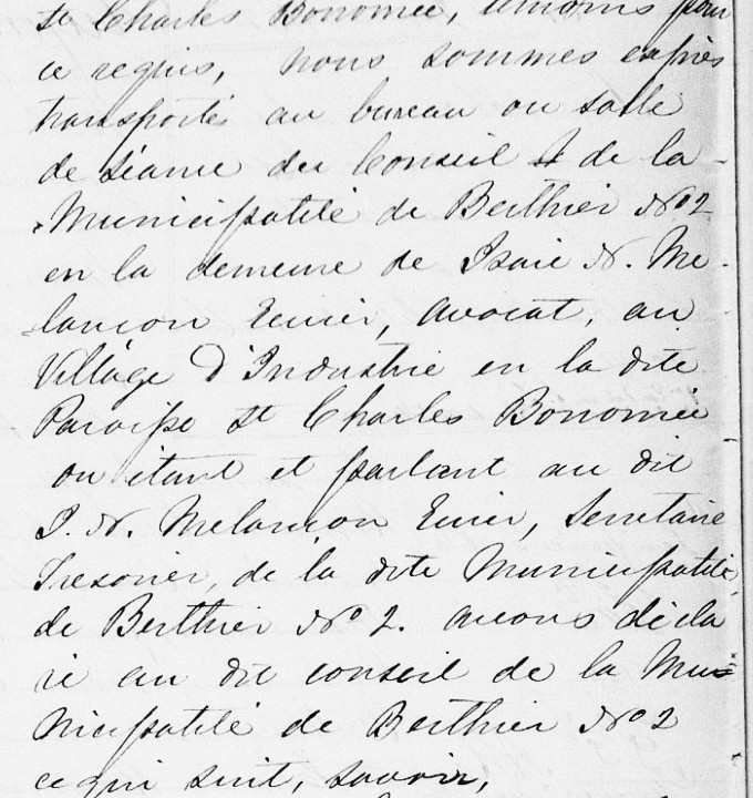 Le 31 janvier une autre sommation a été signifiée par les syndics du marché de l’église à la municipalité de Berthier N°2. Toutes les résolutions adoptées au conseil de la municipalité de Berthier N°2 y sont récapitulées. Une séance du conseil avait eu lieu en la demeure de Isaie N. Melançon avocat du village d’Industrie et secrétaire-trésorier de la municipalité. Plus loin on trouve les noms de Hugh Daly, Antoine Desert et Pierre Ribardy membres du conseil.