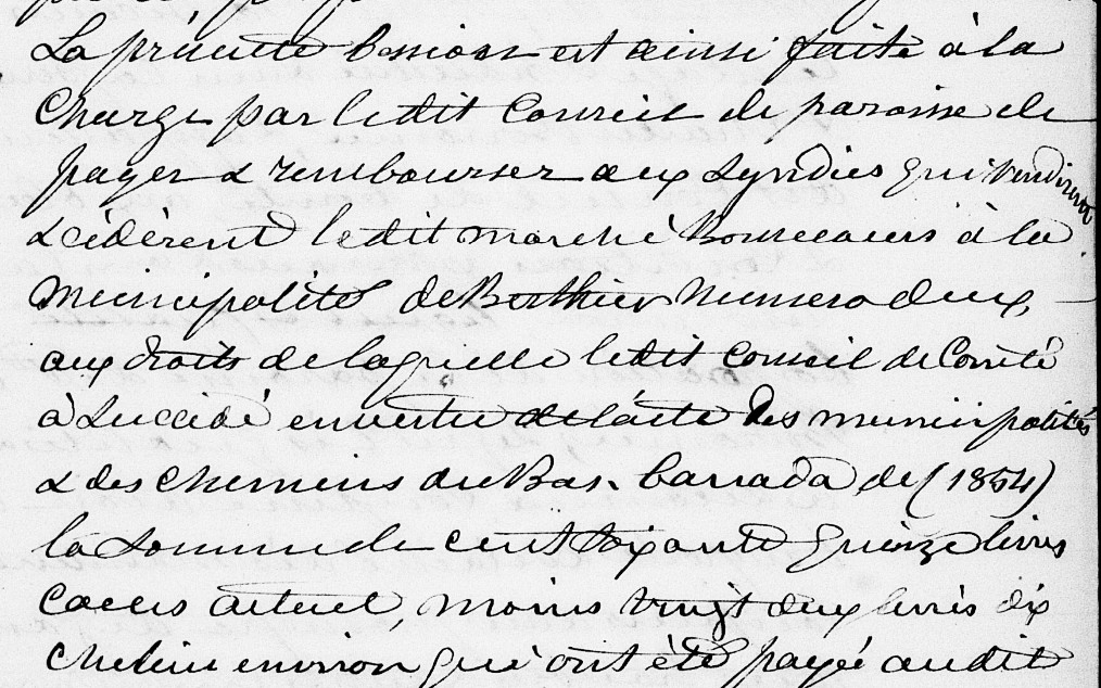 Cette administration avait donc certains pouvoirs de décision mais elle n’avait toujours pas de budget pour l’entretien des chemins faute de pouvoir lever des taxes municipales. Par exemple le 4 janvier 1853 le contrat de déneigement des rues du village d’Industrie a été conclu entre Charles Gulbault inspecteur des chemins et ponts de la paroisse St-Charles-Borromée et Joseph Myé: