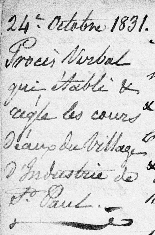 Le village a d’abord été nommé Village d’Industrie de St-Paul. Le 24 octobre 1831 un procès-verbal a été notarié pour établir et règler les cours d’eaux du village d’Industrie de St-Paul. Joseph Han dit Chaussé et Antoine Vaine inspecteurs des clôtures et fossés de la paroisse de St-Paul ont déclaré qu’ils avaient été requis par Barthélémy Joliette pour établir et régler les cours d’eaux nécessaires dans le village. Ils ont donné avis public à la porte de l’église de St-Paul le 16 et le 23 octobre à l’issu du service divin aux intéressés de se trouver ce jourd’hui à 9 heure du matin pour être présents à la visite des inspecteurs.