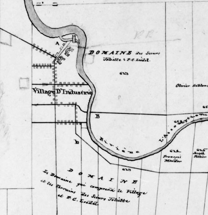 En 1823 quand le moulin a été construit sur la rivière de l’Assomption par les seigneurs de Lavaltrie il était situé dans le deuxième Domaine Seigneurial de Lavaltrie de St-Paul. Il n’y avait pas encore de système municipal et les actes notariés documentent les travaux pour construire les chemins, améliorer le drainage des cours d’eau et creuser des fossés qui étaient faits par les habitants selon une répartition de corvées. En 1835 on voit sur ce plan qu’il y avait déjà plusieurs rues bordées de maison dans le Village d’Industrie qui n’avait pas d’administration locale lui permettant de collecter des taxes. On voit aussi les 2 manoirs des seigneurs Joliette et Loedel sur la rue menant au Moulin.