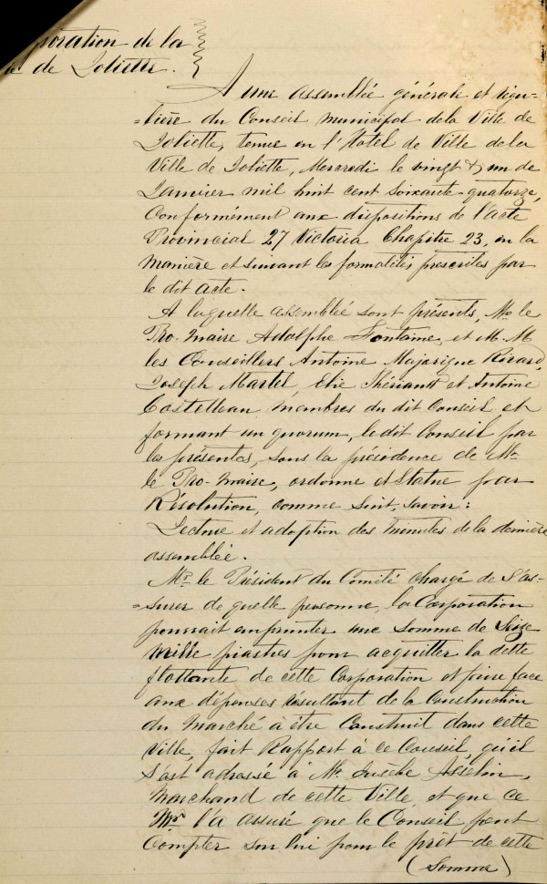 Le 27 janvier 1874 Adolphe Fontaine conseiller et Barthélémy Vézina secrétaire-trésorier ont reconnu au nom de la Corporation de la Ville de Joliette avoir emprunté 16.000 piastres au taux de 6% d’intérêt au marchand Eusèbe Asselin pour acquitter les dettes et financer les dépenses pour la construction du nouveau marché.