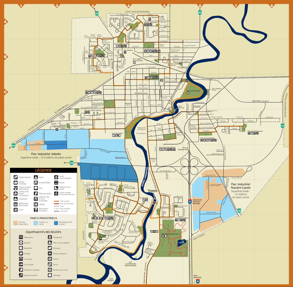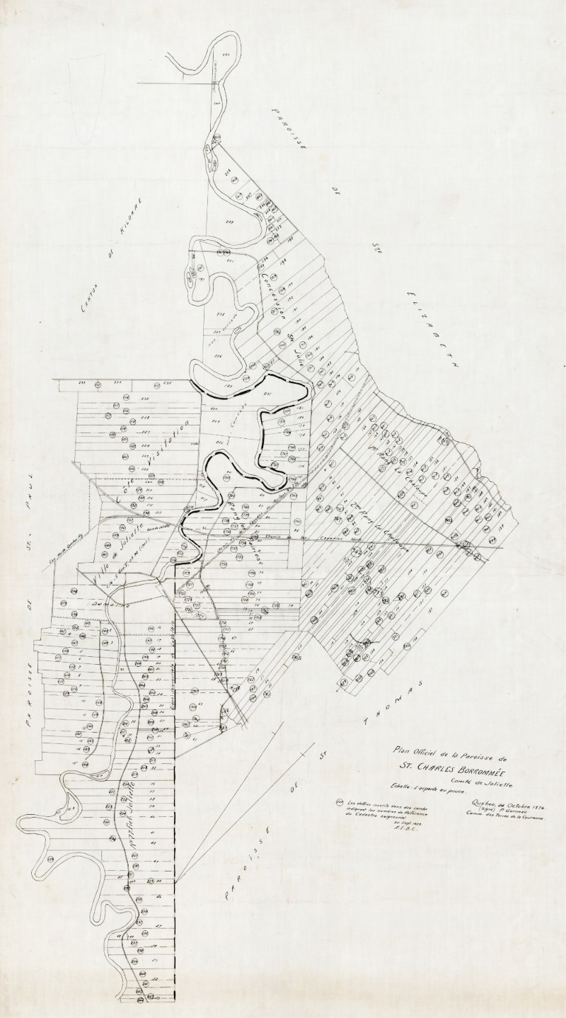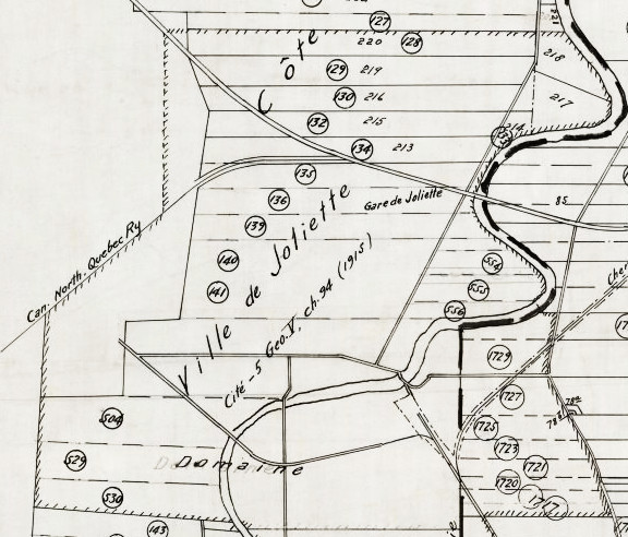 Le territoire de la ville de Joliette a été modifié à plusieurs reprises. Ce plan de la paroisse de St-Charles-Borromée en 1929 montre la division du territoire entre la ville et la campagne selon la loi de 1915.