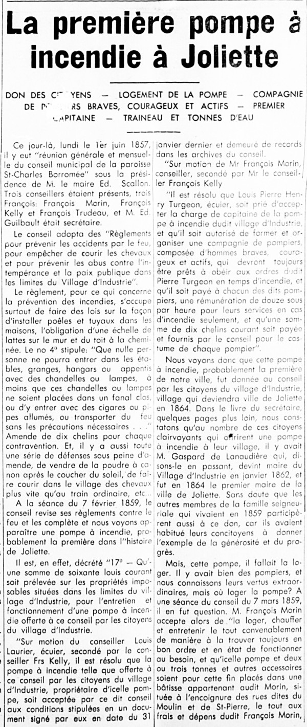 Un article publié en 1946 par Omer Valois, prêtre membre de la Société Historique de Joliette, documente quelques initiatives du conseil municipal de la paroisse St-Charles-Borromée présidé par le maire Edward Scallon qui a véritablement été le premier maire élu à Joliette de 1855 à 1862. Le 1er juin 1857 le conseil avait adopté des règlements pour prévenir les accidents par le feu, pour empêcher les chevaux de courir et pour prévenir les abus contre l’intempérance et la paix publique dans les limites du Village d’Industrie.