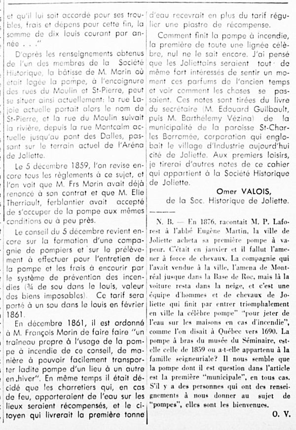 Le 5 février 1866 Joseph Landry a été engagé comme gardien des pompes à incendies par la Corporation de la ville de Joliette. Il devait habiter dans le logement construit dans l’Hôtel de Ville, entretenir le logement, tenir les tonnes emplies d’eau et laisser toujours une personne responsable sur place pour 12 piastres par année. Le 1er août 1868 Jean-Baptiste Lévèque gardien des pompes à incendies de la Corporation a abandonné à Jacques Crépeau tous les droits qu’il pouvait avoir de la Corporation comme gardien des pompes consistant dans le logement dans l’Hotel de Ville et le salaire de 36 piastres par année. L’Hôtel de Ville se trouvait alors dans la station des pompes sur la place Bourget; il a été déménagé dans le marché de la place Lavaltrie en 1874.