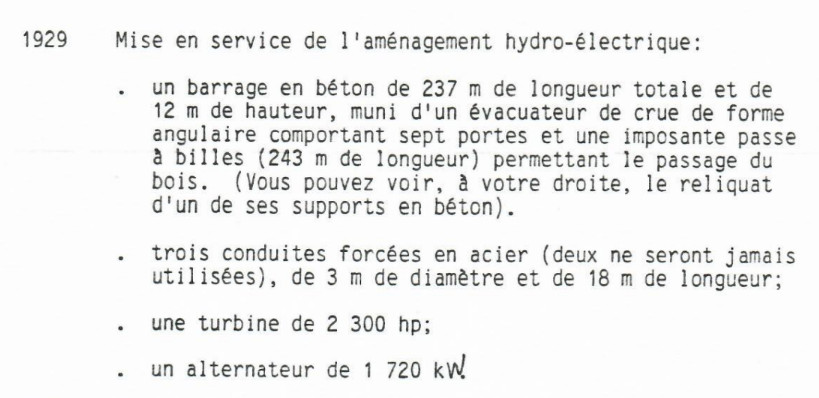 La fiche technique suivante indique que le barrage faisait 90 pieds de long, 5 à 10 pieds de haut, avec un pouvoir d’eau de 300 HP. L’usine construite en 1914 produisait 280 Kw. Le 18 septembre 1914 Edmond Morin et Daniel François Rhéaume propriétaires du moulin à farine voisin acheté à R. Boyce ont protesté contre la Compagnie Electrique des Laurentides qui empiètait sur leur terrain du lot 15a du 6ème rang en érigeant une bâtisse sur un terrain voisin du leur.