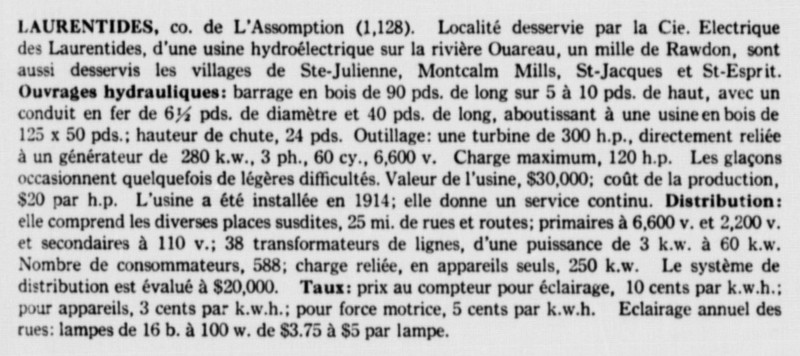 L’idée de la centrale électrique a été celle d’un « patenteux » de village mais c’était un précurseur. Gérard Brady dans « Rawdon mon village » donne des détails sur la suite de l’histoire. En 1912 la Compagnie Électrique des Laurentides a été fondée par des industriels de Rawdon et ses alentours; elle a fait construire un barrage plus moderne, long de 27,4 mètres, haut de 3 mètres, de 300 HP en puissance. La centrale produisait 280 Kw et desservait Rawdon en 1912, Ste-Julienne et St-Jacques en 1913, St-Esprit et St-Lin en 1918. En 1921 une deuxième turbine de 140 HP a été ajoutée.