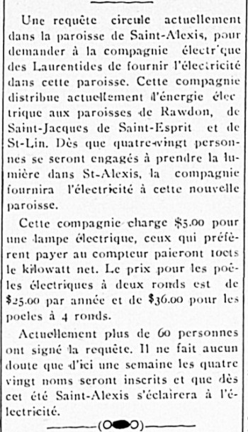 En 1918 la Compagnie Électrique des Laurentides desservait Rawdon, St-Jacques, St-Esprit et St-Lin. Une requête devait être déposée pour desservir St-Alexis; il fallait que 80 personnes s’engagent à s’abonner pour que la compagnie commence les travaux de raccordement. Elle avait déjà 558 abonnés.