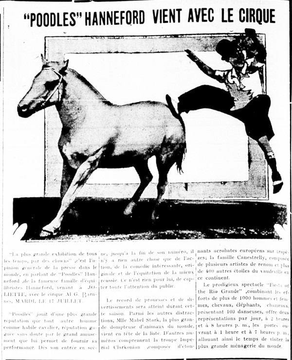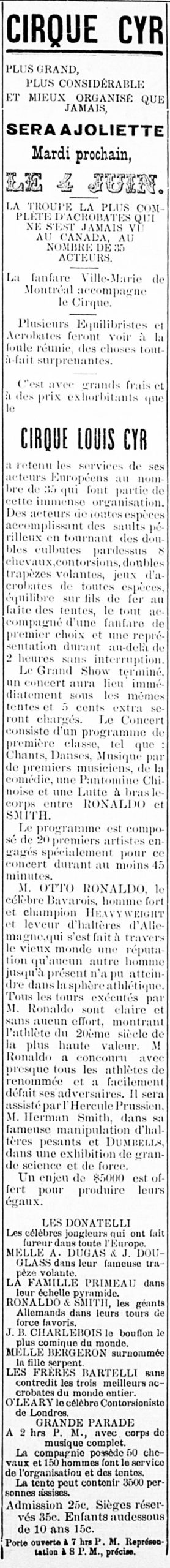 Il y avait alors 2 journaux à Joliette et L’Étoile du Nord a présenté le plus grand, le plus ancien et le plus riche cirque du monde. 3 cirques gigantesques sous 3 tentes séparées; 3 ménageries des 5 continents, 50 collections des plus rares animaux féroces; 4 trains spéciaux 1.000 personnes, 500 chevaux et poneis, 12 tentes énormes imperméables d’une capacité immense. 2 séances seulement sur le terrain Glenny. 30 gardiens aux portes. 12.000 personnes peuvent trouver des sièges. Think big comme disait Elvis Gratton.