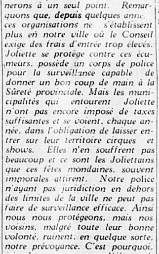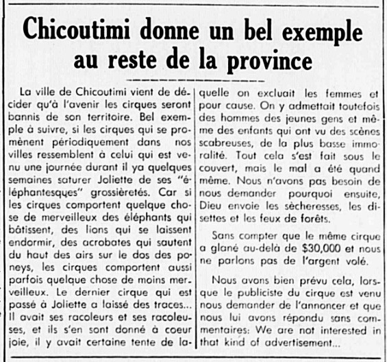 Le dernier cirque qui est passé à Joliette a laissé des traces… Il avait ses racoleurs et ses racoleuses… il y avait une tente de laquelle on excluait les femmes et pour cause. On y admettait toutefois des hommes, des jeunes gens et même des enfants qui ont vu des scènes scabreuses, de la plus basse immoralité. We are not interested in that kind of advertisement.