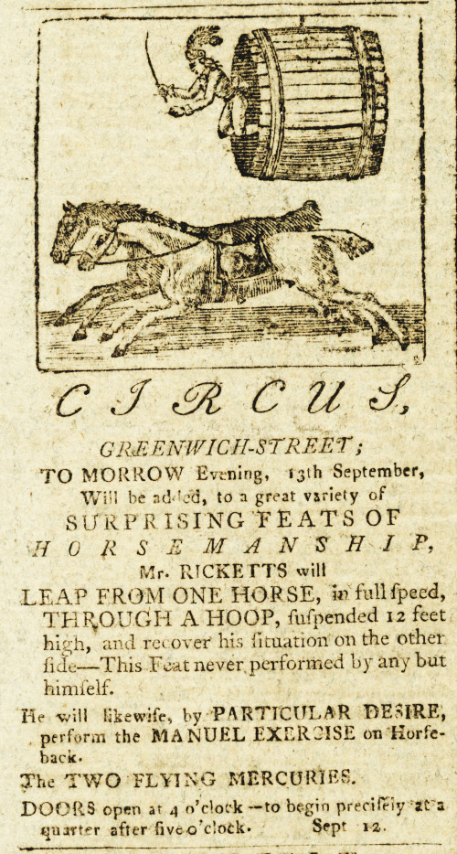 Les premières publicités pour le cirque étaient en anglais et en français. Le cirque s’était installé en dehors de la porte St-Louis et proposait des exercices équestres et autres amusements de récréation. Les loges se vendaient une piastre et les places du parterre une demie, 10 piastres pour la saison. Le spectacle était présenté trois fois par semaine.