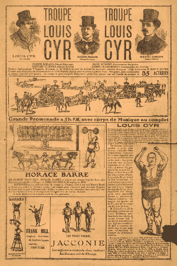 Louis Cyr est un des hommes forts du Québec bien connus; il est devenu une vedette de cirque comme plusieurs autres québécois: Outre les très connus Louis Cyr et Jos Montferrand, on découvre les récits de gens comme Prudent Landry, qui fit partie de la troupe de cirque de Buffalo Bill et dont la mâchoire pouvait s’attaquer à des poids de milliers de livres. On y rencontre aussi quelques femmes fortes, par leur physique et leur caractère, comme Ernestine Valade ou Marie-Louise Sirois-Cloutier. (Les hommes forts du Québec – Luc Gonthier)