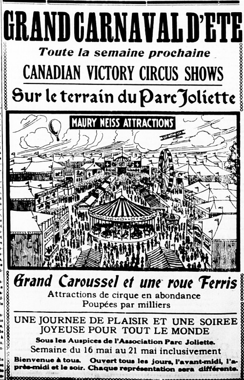 En 1921 le Canadian Victory Circus Shows s’est installé pendant une semaine sur le terrain du Parc Joliette, il s’agissait plutôt d’une foire avec des manèges.