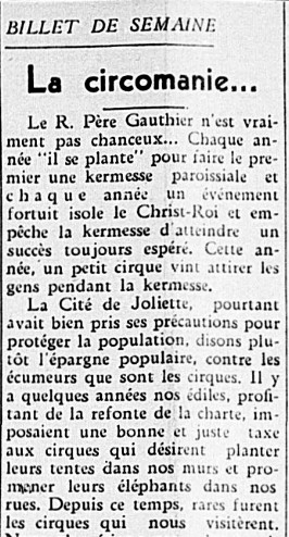 Vers 1930 les autorités municipales de Joliette très catholiques ont commencé à critiquer les cirques qui venaient distraire leurs ouailles. Le cirque est parti – Enfin le cirque, le second depuis un mois est parti. Nous n’entendrons plus sa musique polissonne et criarde dans nos rues.