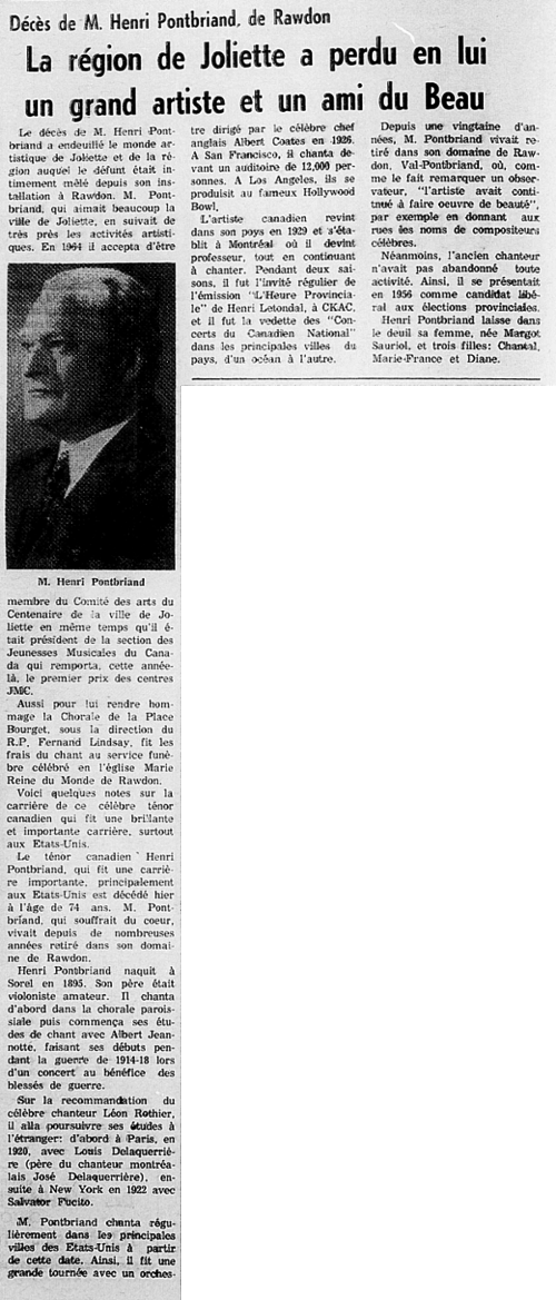 Le 25 juin 1969 L’Action Populaire annonce la mort de Henri Pontbriand, récapitulant sa carrière.