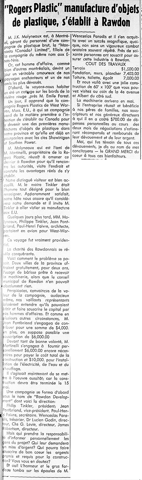 Henri Pontbriand participe aussi à la vie économique de Rawdon pour la fondation de la compagnie Rawdon Plastics en 1950.
