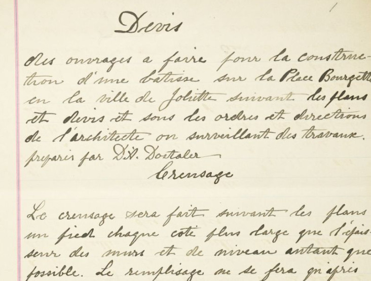 Le 18 juin 1898 la Corporation de la ville de Joliette a conclu un marché avec M. Joseph B. Burgy entrepreneur menuisier de Joliette pour la construction d’une bâtisse devant servir aux pesées, écurie, hangar, logement, etc. et pour autres réparations à la bâtisse de la station des pompes sur la place Bourget conformément aux plans et devis faits et dressés par M. D. A. Dostaler architecte. Le devis de 14 pages est annexé à l’acte.