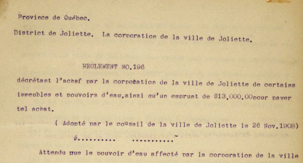 La ville de Joliette vient d’acquérir les pouvoirs hydrauliques, appartenant à M. D. A. Dostaler pour treize mille piastres. En faisant cette acquisition, la corporation a en vue de se procurer des moyens encore plus efficaces de protéger la propriété contre les dangers du feu et de s’assurer une prise d’eau considérable pouvant alimenter la ville pendant une très longue durée. (La presse, 28 décembre 1908)
