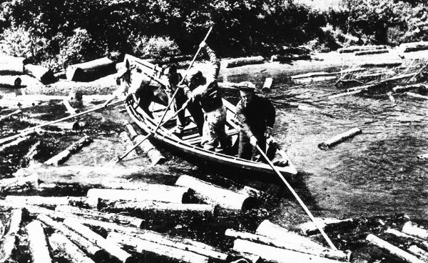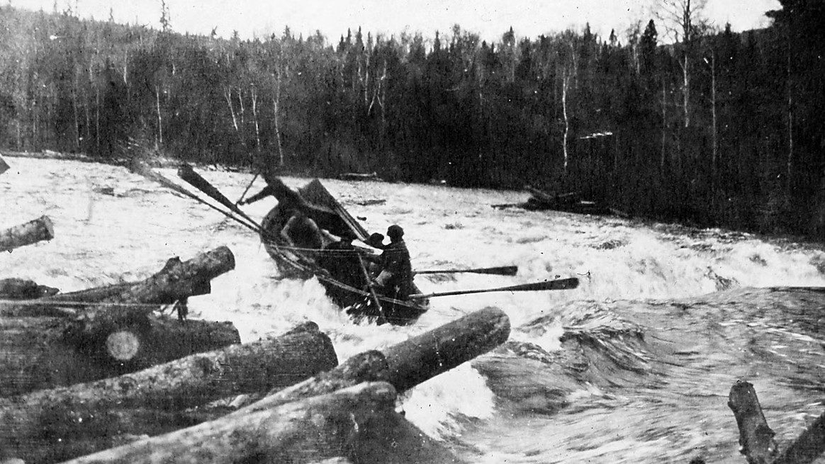 Sur cette photo un crochet à embâcle est lancé pour arrimer le bateau à un billot et pouvoir travailler à défaire la jam. Les bateaux étaient portagés dans les chutes trop périlleuses.