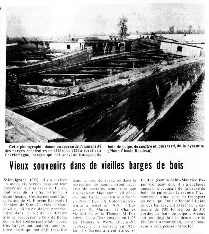 L’usine de transformation du bois en pâte à papier de Charlemagne a fermé vers 1926. La drave sur le fleuve Saint-Laurent n’étant pas possible, les pitounes devaient alors être chargées sur des barges pour être transportées aux usines du Cap-de-la-Madeleine. Des barges d’une capacité de 800 tonnes ou 31 cordes de bois de pulpe avaient été construites pour la Saint-Maurice Paper.