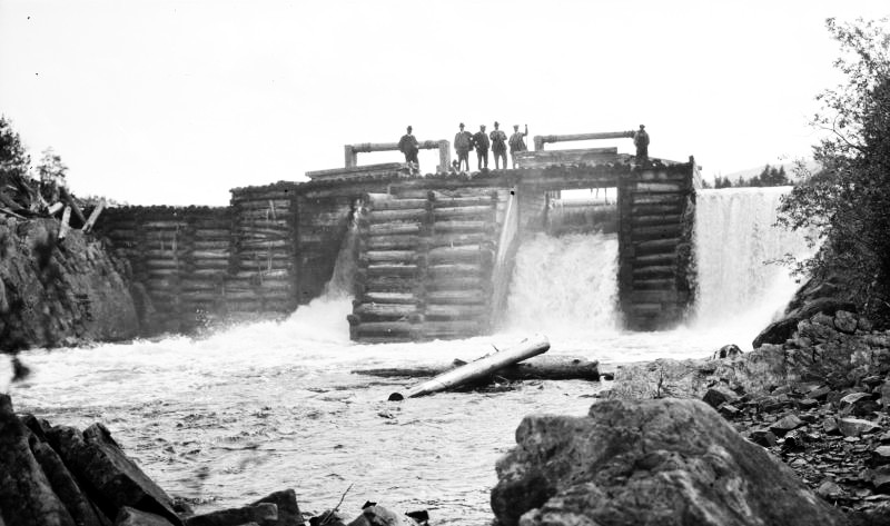 Quand le barrage a été rehaussé en 1929 une glissière pour les billots a été construite. Selon sa fiche technique le barrage était muni d’une passe à billes de 243 mètres de longueur permettant le passage du bois. Sur la photo on voit la glissière et une plate-forme la longeant qui permettait aux draveurs de manipuler les billots coincés.