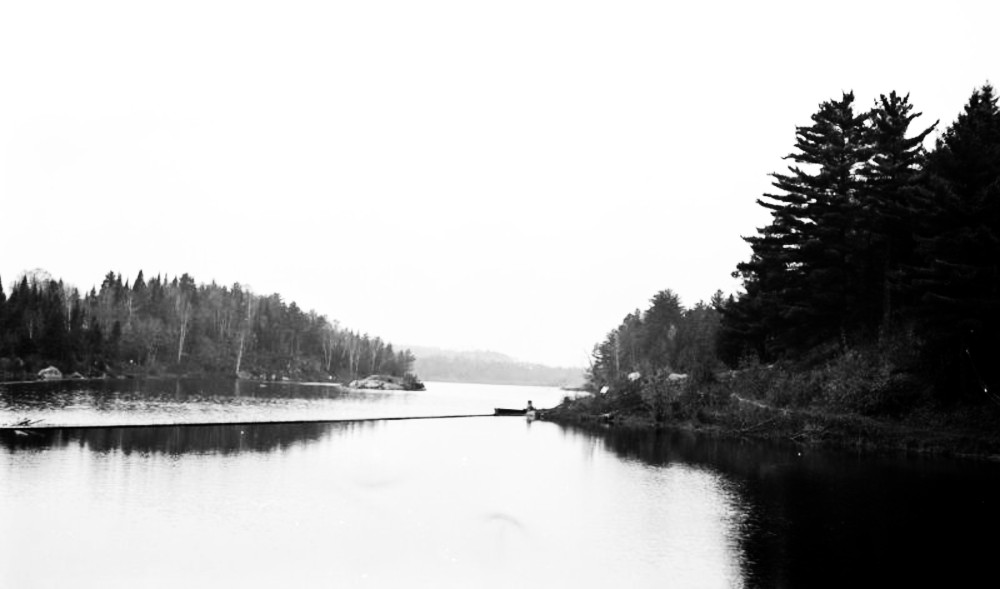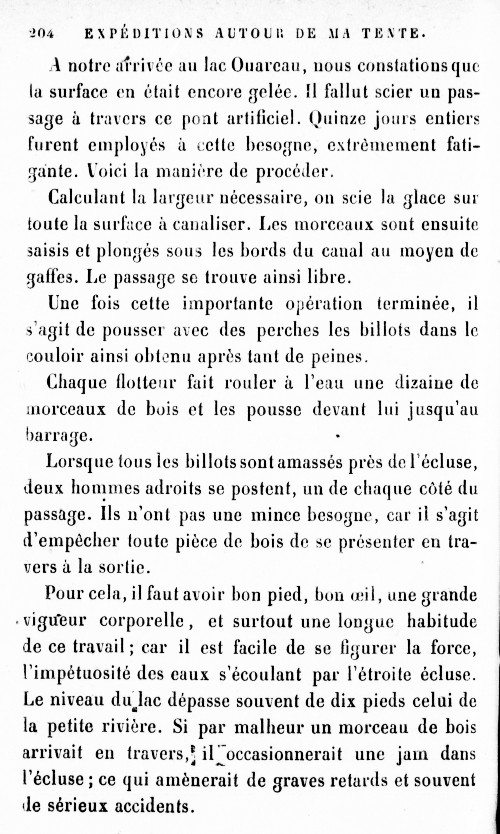 En 1874 il n’y avait pas encore de bateaux à vapeur pour tirer les billots et la technique pour leur faire traverser le lac Ouareau était laborieuse. Les hommes avaient scié la glace pour ouvrir un chenal jusqu’à la décharge du lac.