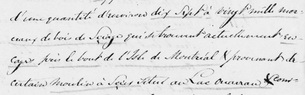 Le 23 janvier 1844 James Stansfeld marchand de l’Industrie a acheté tous les billots que Louis Galère pourrait couper pendant l’hiver; il s’engageait à descendre le bois sur la rivière Ouareau et avait le droit d’engager un bâtiment pour le touer . Un autre marché du 9 février 1854 mentionne que 10.000 pieds cubes d’épinette rouge devaient être amenés au boom du capitaine Benoni Perreault à St-Paul, c’est-à-dire au confluent des rivières l’Assomption et Ouareau, pour être collés (mesurés), encagés solidement et descendus à Québec.