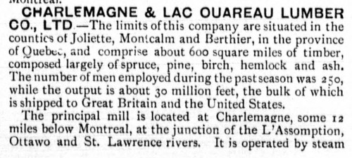La compagnie Charlemagne & Lac Ouareau Lumber Co qui a racheté la faillite a été fondée en 1886; le mandat de la compagnie était d’exploiter le bois sur la rivière Ouareau en améliorant les installations pour faire flotter le bois jusqu’à Charlemagne où se trouvaient ses installations principales; elle avait aussi des moulins et des bureaux au village Montcalm entre Rawdon et St-Liguori. En 1897 la compagnie détenait environ 600 milles carrés de limites de bois et employait 250 hommes, c’était de loin le principal exploitant sur la rivière. En 1916 elle a été achetée par la Saint-Maurice Paper qui a ensuite été achetée par la Consolidated Paper.