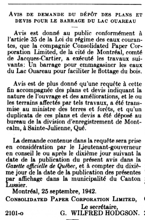 En 1942 la Consolidated Paper devenue propriétaire des droits de coupe avait la responsabilité de l’entretien des aménagements servant au flottage du bois et elle a fait reconstruire le barrage du lac Ouareau.
