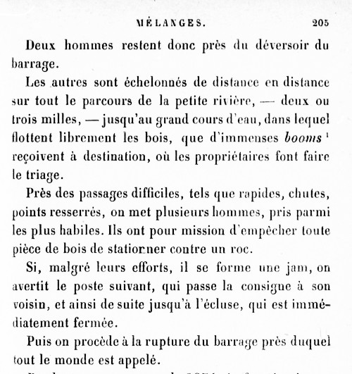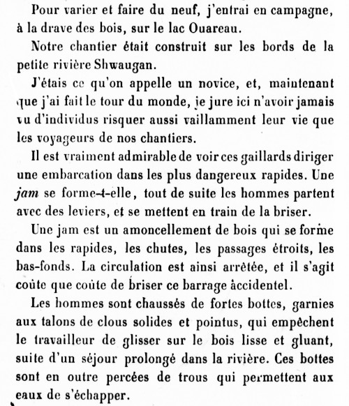 Sa description de la drave en 1874 n’est pas très différente de celle de Raymonde Beaudoin. Les hommes sont chaussés de fortes bottes, garnies aux talons de clous solides et pointus, qui empêchent le travailleur de glisser sur le bois lisse et gluant, suite d’un séjour prolongé dans la rivière. Ces bottes sont en outre percées de trous qui permettent aux eaux de s’échapper. L’auteur décrit la rudesse et le danger de ce travail: dégager les embâcles, patauger dans l’eau froide…