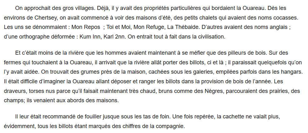 Le récit se termine par la description des draveurs descendant la rivière debout sur les billots et faisant la démonstration de leur force et de leur habileté, un récit pittoresque.
