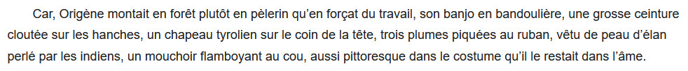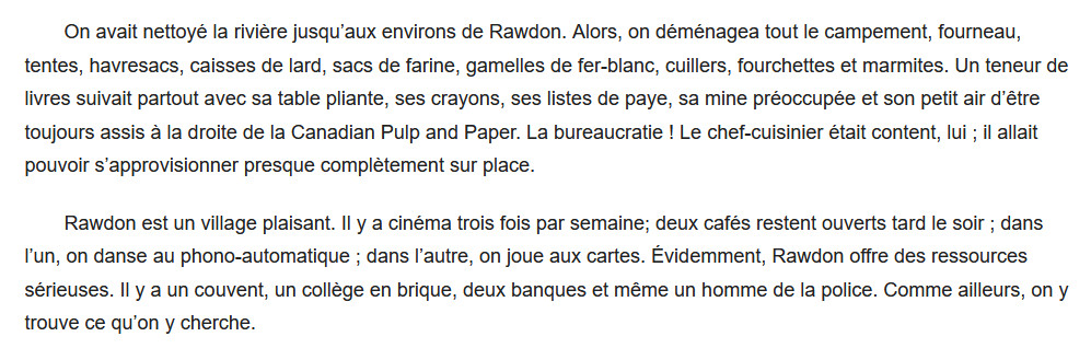 Dans la jeunesse d’Origène, ça avait été un job magnifique. On couchait sur le sol; on mangeait des fèves au lard d’un bout à l’autre de la saison; on ne savait pas encore très bien se servir de la dynamite; lorsqu’on faisait sauter un empilement de bois sur quelque écueil, souvent, dans l’explosion, un homme perdait une jambe, un bras. Une vraie besogne! Une vie propre à exalter le cœur étrange de l’homme qui, tant qu’il est jeune, souhaite le danger. Et même maintenant que les hommes couchaient sur des paillasses et mangeaient de vrais menus d’hôtel, avec des vitamines et des légumes depuis que le gouvernement s’était fourré le nez dans les affaires de la compagnie, même maintenant la drave restait une belle occupation, digne des courageux.