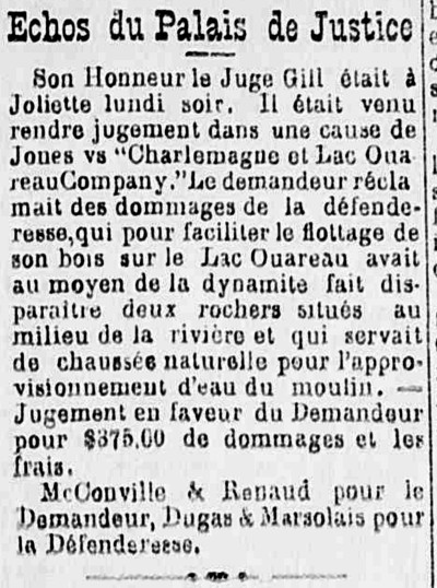 En 1891 la Charlemagne & Lac Ouareau Company a été poursuivie par William Jones pour avoir dynamité 2 rochers qui servaient de chaussée naturelle à son moulin situé sur la rivière Ouareau en amont de Rawdon (parc des Cascades) pour faciliter le flottage de son bois.