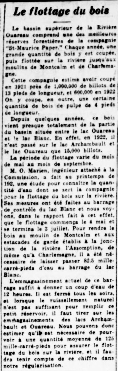 En 1925 la compagnie St-Maurice Paper estimait avoir coupé près de 1 million de billots de 13 pieds et une certaine quantité de bois de pulpe de 4 pieds. Ce bois venait presque entièrement du secteur situé entre le lac Ouareau et le lac Blanc. L’article explique que pour faire descendre le bois le barrage du lac Blanc était refermé la nuit pour emmagasiner l’eau et rouvert le matin.
