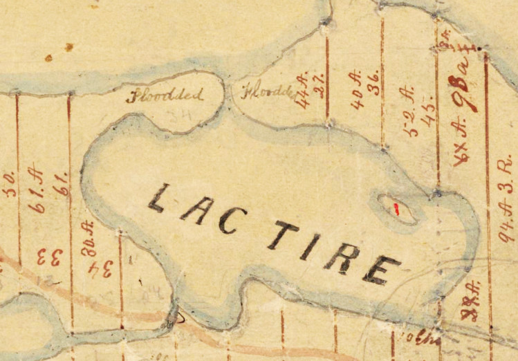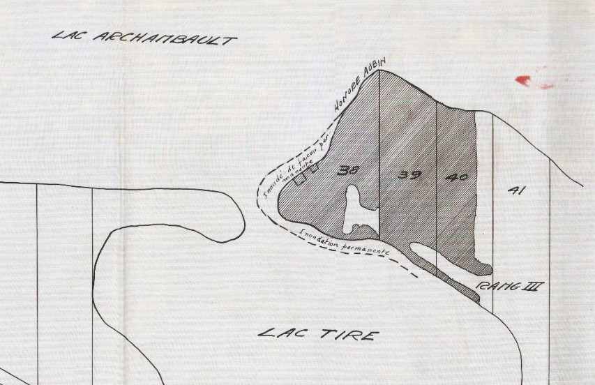 Le 9 octobre 1894 Léandre Coutu de St-Donat s’est engagé à livrer à Edward Fisk le bois de pin et d’épinette à prendre sur les lots N°32, 33, 34, 35, 36 et 37 fu 4ème rang du canton de Lussier au moins 4.000 billots par hiver et les livrer en bas de la dam du grand lac Ouareau. Le 17 octobre 1902 Léandre Coutu a donné à The Charlemagne et Lac Ouareau Lumber des droits sur ses terrains 31 à 37 entre les lacs Tyr (Tire) et Archambault pour y passer à pied, en voiture ou autrement, y transporter leurs bateaux à vapeur ou autres, pour y faire des bâtisses et paître leurs animaux. Sur les plans suivants on voit que la passe entre les lacs Archambault et Tire avait été artificiellement élargie en inondant des terres; elle est toujours plus large aujourd’hui qu’elle ne l’était naturellement.