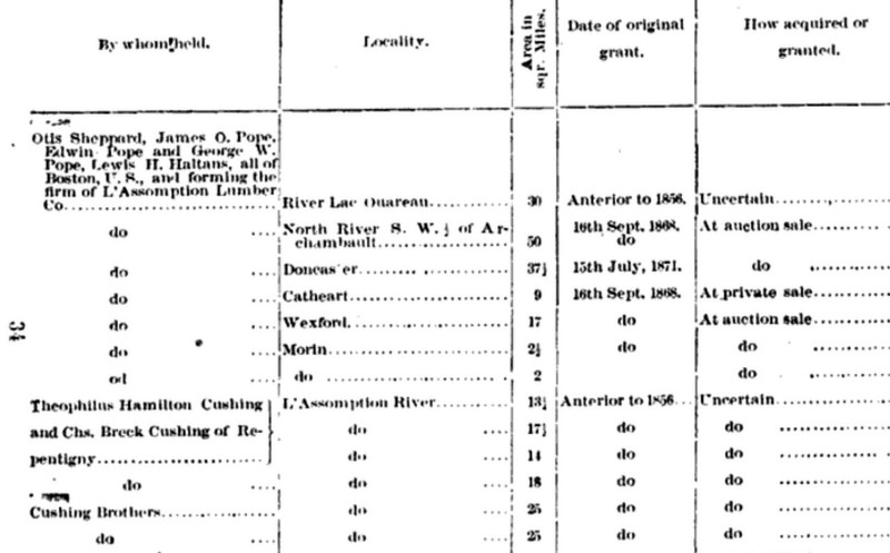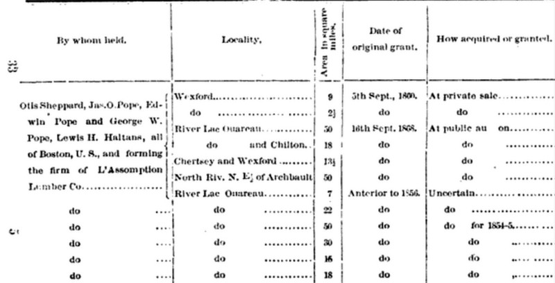 Les limites de bois de l’Assomption Lumber Co ont été mises en vente en 1885 lors de la faillite de la compagnie, 295 milles carrés.