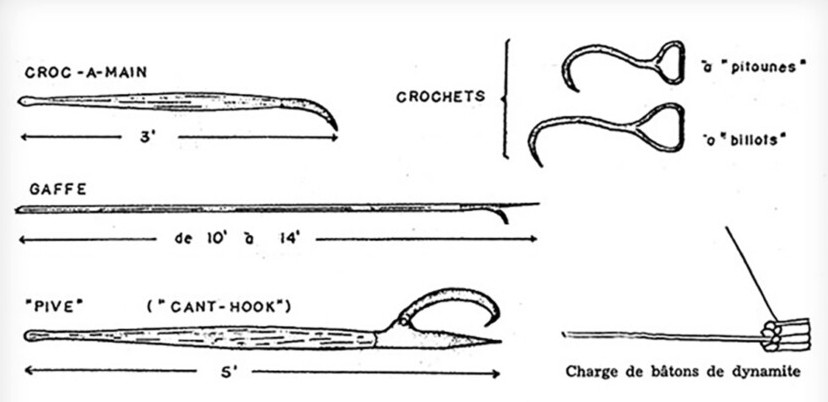 Les hurlots suivaient la drave en marchant le long des rives, munis de leurs gaffes. Il suffisait d’un billot coincé par un rocher pour créer un empilement. Les embâcles devaient parfois être défaites à la dynamite, mais toujours en dernier recours car ça endommageait les billots.