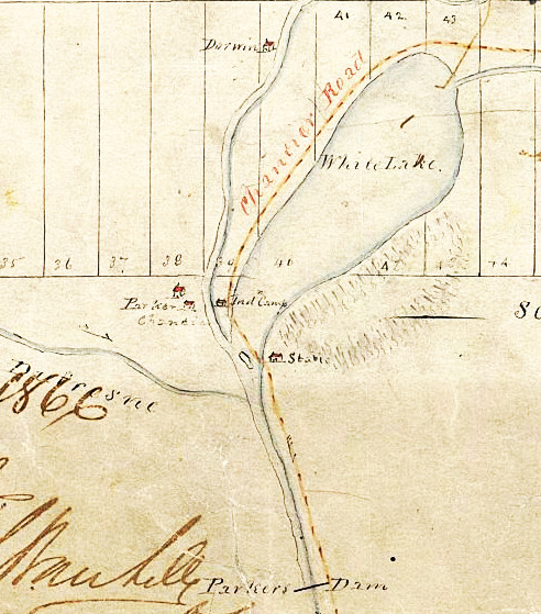 En 1865 les alentours du lac Blanc (White lake) étaient aménagés pour les chantiers de bois; on voit sur ce plan les chantiers de M. Parker et plusieurs barrages qu’il avait fait construire en amont du lac Blanc. On remarque aussi la présence de 2 camps indiens près des chantiers de bois. William H. Parker a d’abord été l’agent de la Hunterstown Lumber Co puis vers 1869 de l’Assomption Lumber Co.