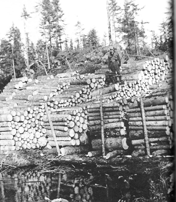 Les billots cordés sur le bord des ruisseaux et des rivières étaient poussés dans le courant par les draveurs.