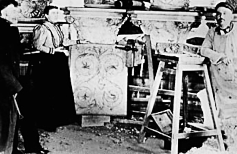 Ce portrait d’Alphonse Durand et Marie Schwerer dans leur atelier de sculpture est daté de vers 1900 par les archives du Canada.