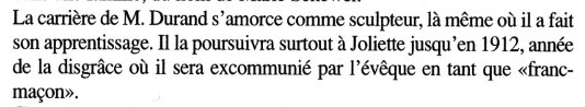 Alphonse Durand a effectivement la réputation d’avoir été franc-maçon mais il cachait bien son jeu car on l’a retrouvé tout au long de sa carrière associé à des événements religieux où il n’était pas obligé d’aller. Il a construit plusieurs édifices pour les communautés religieuses de Joliette et de Lanaudière et semble même avoir été proche de Mgr. Archambault. Je me demande d’où peut venir cette réputation amusante que rien ne vient documenter sérieusement.