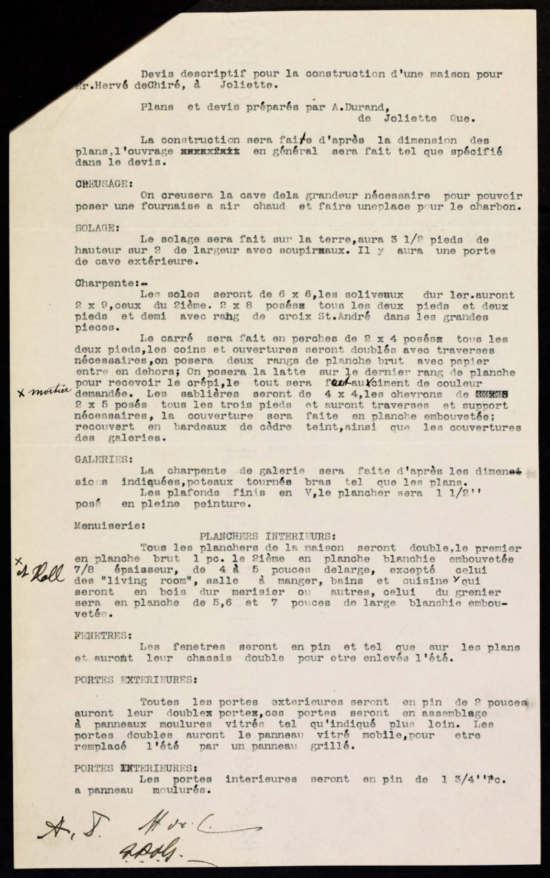 D’après sa signature le nom de la maison devrait être Hervé de Chirée de Cournaud mais le nom de cet aristocrate normand a souvent été mal orthographié, par la ville de Joliette comme par les journalistes. Ce marché notarié donne des informations intéressantes sur le travail d’Alphonse Durand à cette époque de sa vie.