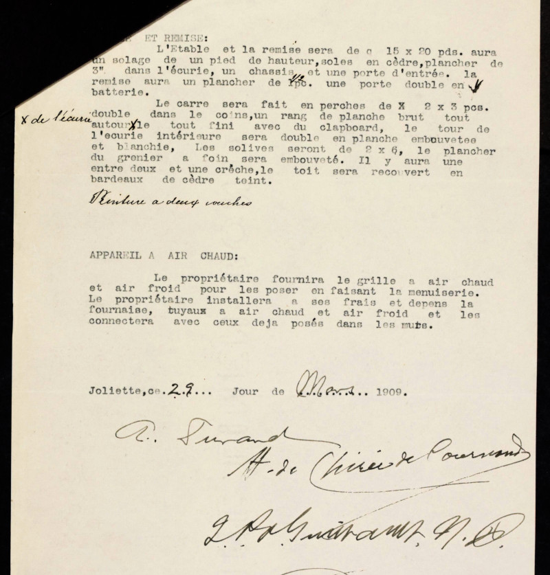 Mr. Alphonse Durand architecte entrepreneur de la ville de Joliette agissait au marché au nom de A. Durand & Cie. Il a conclu ce marché avec Hervé de Chirée de Cournaud voyageur de commerce de la cité de Montréal en s’engageant à faire et parfaire bien dûment suivant les règles de l’art au dire d’experts et gens à ce connaissant tous les ouvrages de maçonnerie, charpenterie, couverture, menuiserie, serrurerie, couverture, verrerie, peinture et autres qu’il convient de faire pour la construction parfaite et entière d’une maison en bois et ciment sur un terrain au coin des rues Manseau et St-Edouard (Lavaltrie aujourd’hui). Les plans devaient rester aux mains de l’architecte et les devis étaient annexés au marché, les travaux devant commencer immédiatement pour être terminés en juillet 1909. Le marché a été conclu pour 2.500 piastres.