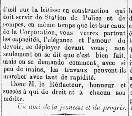 Ses travaux pour la chapelle du Sacré-Coeur du collège, la maison industrielle et la station de police et de pompes sont louangés. Vous verrez partout les capacités, l’élégance et l’amour du devoir, se déployer devant vous; non seulement on se dit que c’est bien fait, mais on se demande comment, avec si peu de mains, les travaux peuvent-ils marcher avec tant de rapidité.