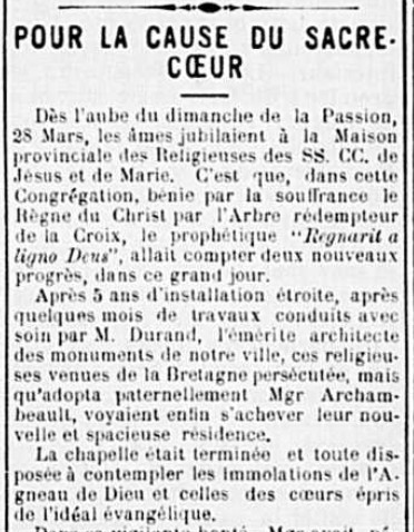 La maison provinciale des Religieuses des SS. CC. de Jésus et de Marie a été construit en 1908 en quelques mois de travaux par M. Durand l’émérite architecte des monuments de notre ville. L’inauguration de la chapelle a eu lieu le 28 mars 1909.