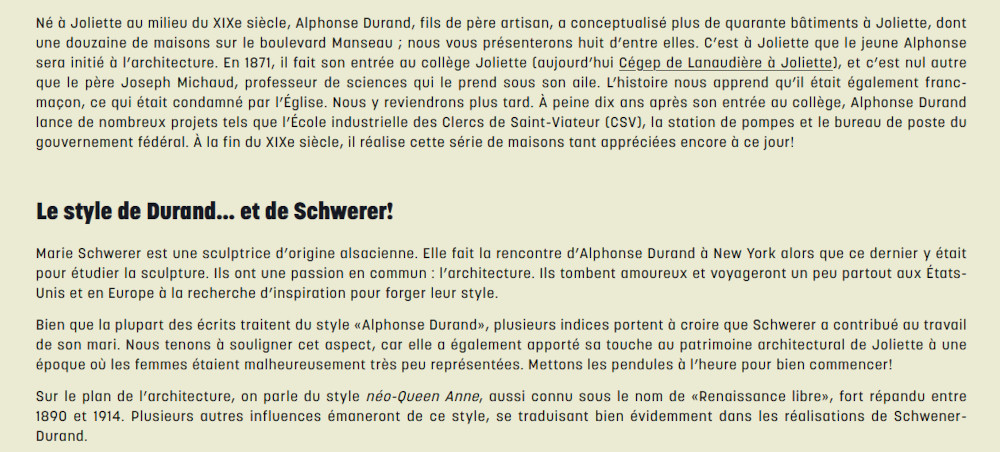 Alphonse Durand a été un important architecte et entrepreneur de Joliette. De nombreuses maisons qu’il a constuites sont instrites au patrimoine bâti de la ville. Avec son épouse d’origine alsacienne, Marie Schwerer, ils étaient aussi sculpteurs, dessinateurs et décorateurs d’intérieur. La ville de Joliette a beaucoup documenté leur travail dans ses publications et sur les panneaux historiques affichés dans ses rues mais les informations y sont parfois approximatives, cette documentation vient les préciser.