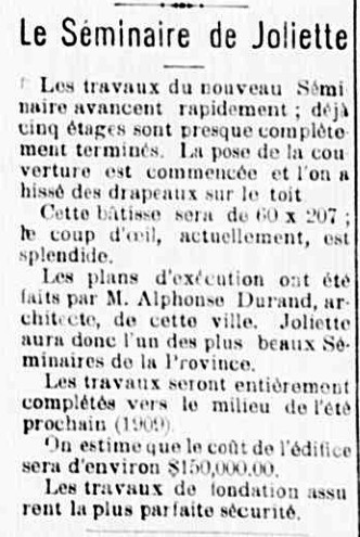 Les travaux du nouveau Séminaire de Joliette dont les plans avaient été exécutés par Alphonse Durand devaient se terminer pendant l’été 1909.