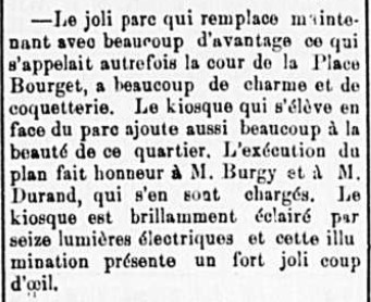 Le premier parc public de la ville de Joliette a été construit entre la place Bourget et le palais de justice, derrière la station des pompes et l’hôtel de ville. Il y avait un kiosque à musique éclairé par 16 lumières électriques et des parterres; le plan avait été établi par M. Burgy et M. Alphonse Durand.